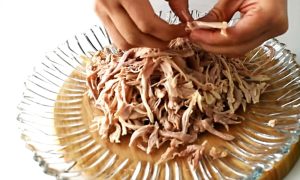 Uvařená kuřecí stehna zbavte kůže a oberte z nich maso, které natrhejte podle vláken na malé kousky.