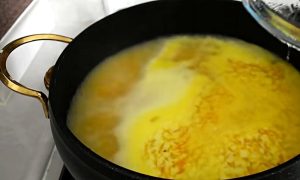 Do pánve přisypejte dvě lžíce hladké mouky a za stálého míchání ji nechte zarestovat.