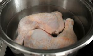 Dvě kuřecí stehna vložte do hrnce, zalijte je vodou tak, aby dosahovala asi 2 cm nad maso, přidejte lžičku soli a přiveďte k varu. Nechte je vařit nejméně tak dlouho, dokud maso zcela nezměkne. Avšak čím déle, tím silnější a chutnější vývar bude. Po dovaření vyjměte kuřecí stehna z hrnce.