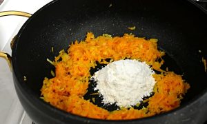 V pánvi rozpusťte lžíci másla, přidejte k němu lžíci olivového oleje a orestujte nastrouhanou mrkev, dokud nepustí barvu do másla. Pak přisypejte cibuli a pokračujte několik minut v restování, dokud cibule nezesklovatí. Poté vmíchejte česnek a vše dál několik minut opékejte.