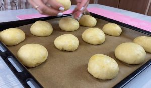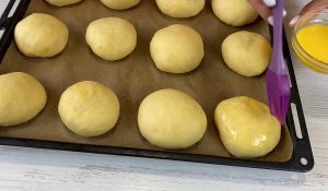 Odstraňte fólii a těsto položte na pracovní plochu. Lehce promíchejte rukama, vytvořte z něj válec a rozdělte ho na 12 částí. Z každého kousku vyválejte kuličku a všechny položte na plech vyložený pečicím papírem. Těsto zakryjte čistou utěrkou a nechte ho takto kynout ještě půl hodiny. Kuličky zvětší svou velikost, a proto mezi nimi musíte nechat mezery.