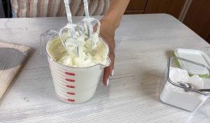 Mezitím smíchejte smetanu se špetkou vanilky a přidejte moučkový cukr. Šlehejte, dokud smetana nezhoustne.