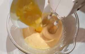 Do hluboké mísy vyklepněte dvě vajíčka a elektrickým šlehačem je rozšlehejte do jemné, bělavé pěny. Během šlehání přidejte ve dvou fázích cukr a také vanilkový cukr. Když směs začne houstnout, přidejte částečně rozpuštěné máslo a dále šlehejte, dokud nezískáte hustou a krémovou kompozici.