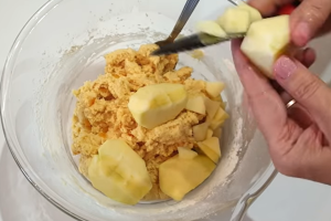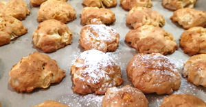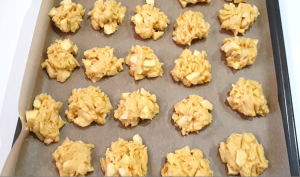 Oloupejte slupku ze dvou jablek, rozkrojte je na čtvrtiny a vyjměte z nich jadřince. Čistou dužninu pak rozkrájejte na malé a tenké kousky, které vsypte do těsta a dobře je do něj zamíchejte. Připravte si plech vyložený pečicím papírem. Lžící odebírejte kousky těsta s jablky a vyhazujte je na plech v mírných rozestupech a pokaždé je vytvarujte do podoby kulaté hrudky. Pokud chcete, prsty je ještě dotvarujte, vložte je do trouby vyhřáté na 170 °C a pečte je asi 20 až 30 minut dozlatova.