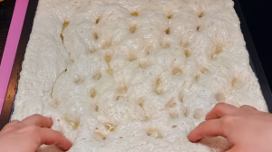 Plech na pečení vytřete olivovým olejem a vyklopte do něj vykynuté těsto, které rukou rozprostřete rovnoměrně po celé ploše pekáčku. Znovu zakryjte fólií a nechte kynout dalších 30 minut. Poté opatrně fólii sloupněte, pokapejte povrch olejem (30 ml) a pomocí prstů těsto po celé ploše propíchejte (díky tomu se během pečení na těstě nebudou tvořit bubliny).