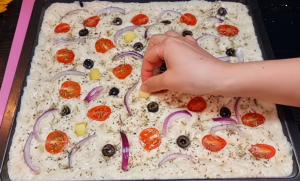 Italský chléb focaccia s rajčaty, cibulí a černými olivami - postup přípravy