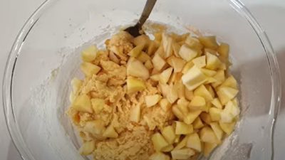 Přestaňte šlehat a do těsta vmíchejte zbytek mouky a následně pomerančovou kůru s oloupanými a nakrájenými jablky.