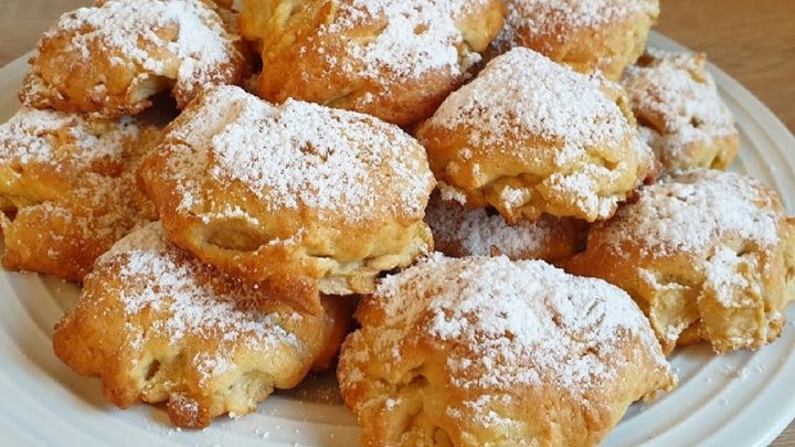 Jablečné koláčky pečte v předehřáté troubě na 170 °C po dobu 25 minut, do růžova. Po vychladnutí dezert podávejte posypaný moučkovým cukrem.