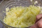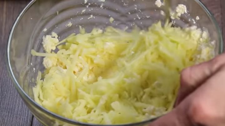Nejprve si v míse smíchejte sýr spolu s vejci, solí, krupicovým cukrem, vanilkovým cukrem a případně i s mletou skořicí. Následně do směsi přidejte i loupané a nahrubo strouhané jablko, přelijte kefírem a zasypte hladkou moukou s kypřícím práškem. Ze všech surovin vypracujte hladké polotekuté těsto.