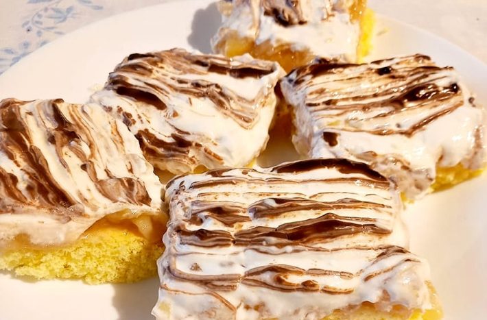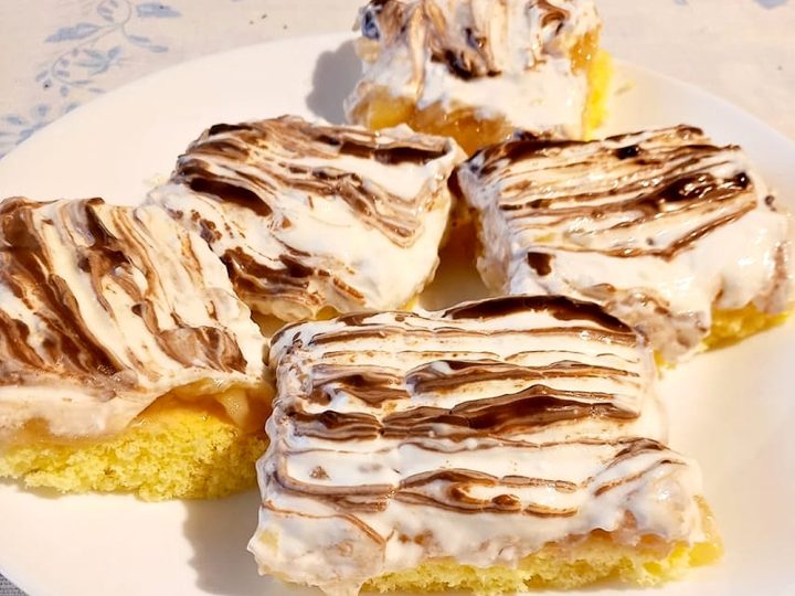 Kombinace piškotového těsta, jablek s pudinkem a tvarohu s zakysanou smetanou tvoří výtečný dezert. Recept na něj nám poskytla paní Lenka Sedláčková.