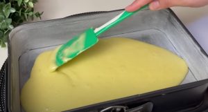 Obdélníkovou dortovou formu o rozměrech 28×19 centimetrů vymažte máslem a vysypejte moukou. Nalijte do ní půlku těsta. Rozehřejte troubu na 180 °C, (pokud máte troubu s cirkulací, tak na 170 °C) a pečte koláč asi 15 minut. Po upečení ho nechte vychladnout, ale nevyndávejte ho z formy.
