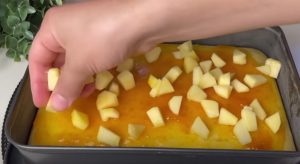 Jablka zbavte jádřince. Dvě nakrájejte na menší kostičky a dvě na tenké plátky. Upečené těsto pomažte meruňkovou marmeládou a na ni dejte kostičky jablek. Vše zalijte druhou polovinou těsta, na které rozložte plátky jablek. Poté dejte koláč dál péct na 180 °C (nebo 170 °C v závislosti na vaší troubě) na 30 až 35 minut.