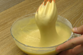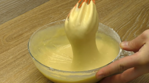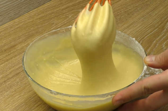 V první řadě si připravte těsto. Do hluboké mísy rozklepněte 3 vejce. Přidejte 150 gramů cukru a metličkou rozšlehejte, dokud nezískáte dokonale hladkou směs. Poté za stálého míchání přilijte 180 ml mléka a pokračujte ve šlehání. Do mísy poté prosejte 300 gramů mouky a přidejte prášek do pečiva a vanilkový cukr. Opět vše důkladně, pomalu a jemně promíchejte metličkou. Těsto musí být dokonale hladké a bez hrudek, ale nesmíte ho přešlehat.