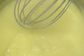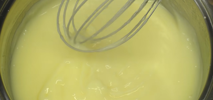 Jakmile budete mít těsto takto připravené, můžete se pustit do krému. Není to vůbec nic složitého, ale musíte si připravit malý rendlík s rukojetí nebo hrnec. Do hrnce rozklepněte 2 vejce. Přidejte 75 gramů cukru, 23 gramů kukuřičného škrobu, 5 gramů vanilkového cukru a vše důkladně promíchejte metličkou. Až budete mít hladkou směs, můžete přidat 375 ml mléka, promíchat a postavit na plotnu. Vařte na mírném ohni za stálého míchání.