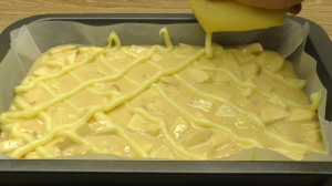 Poté očistěte a nakrájejte všechna tři jablka na středně velké kostky. Jablka přidejte do připraveného těsta a celou směs nalijte na plech vyložený pečicím papírem. Pudinkový krém vložte do cukrářského sáčku a udělejte na těsto s jablky proužky.