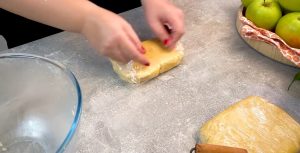Posypejte pracovní desku trochou hladké mouky. Vyndejte z lednice první část těsta (druhou nechte zatím uvnitř), rozbalte ho a rozválejte ho na tenký obdélníkový plát o velikosti plechu na pečení (my jsme použili plech o rozměrech 39 x 26 cm). Přeneste ho do plechu a rozprostřete na něj do rovnoměrné vrstvy jablkovou náplň.