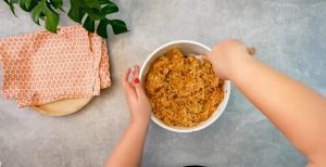 Oloupejte jablka, odstraňte stopky a jadřince a čistou dužninu nastrouhejte na hrubém struhadle do hluboké mísy. Posypejte jablka cukrem, promíchejte a počkejte, až pustí šťávu. Tu důkladně vymačkejte přes cedník nebo rukama a vyždímanou dužninu vložte do suché misky. Přidejte k nim dvě čajové lžičky skořice a krupici a dobře promíchejte.