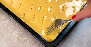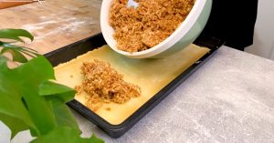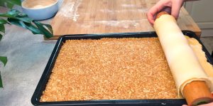 Nyní vyndejte druhou část těsta, opět ji rozválejte do obdélníku o velikosti plechu a zakryjte s ním náplň v plechu.
