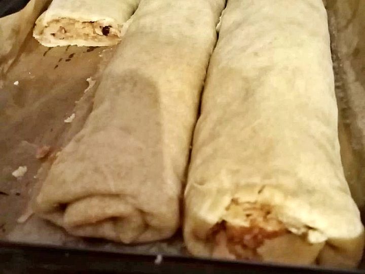 Odpočinuté těsto rozdělte na tři stejně velké díly. Každý z nich vyválejte na obdélníkovou placku. Jablka oloupejte, zbavte je jadřince a nastrouhejte je nahrubo. Vyválenou placku posypejte strouhankou a rozprostřete na ni část nastrouhaných jablek, která posypejte rozinkami, skořicovým cukrem a jemně namletými ořechy. Pokud chcete, můžete přidat také vanilkový cukr nebo třeba strouhaný kokos.
