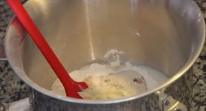 Nejprve připravte „tanjong“. Do hrnce nalijte 100 mililitrů mléka a přidejte 20 gramů hladké mouky. Vše důkladně promíchejte, položte hrnec na kamna a na středním žáru za stálého míchání vařte 3 minuty. Pak odstavte z kamen.