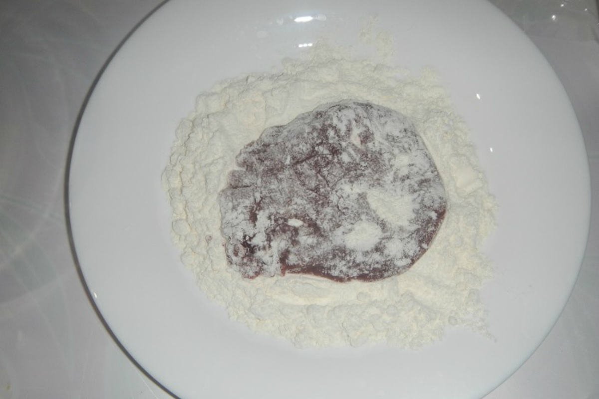 Rozložte játra na kuchyňské prkénko, zakryjte je silnější igelitovou potravinářskou fólií a paličkou je jemně rozklepejte do tenčích a větších plátků. Buďte opatrní, hladká svalovina jater by se mohla snadno rozbít na padrť, a to nechcete. Pokud jsou játrové plátky příliš velké a vy byste rádi řízečky menší, chuťovkové, pak maso pokrájejte na kousky o požadované velikosti. Mějte však na paměti, že se během tepelné úpravy o něco málo smrsknou.