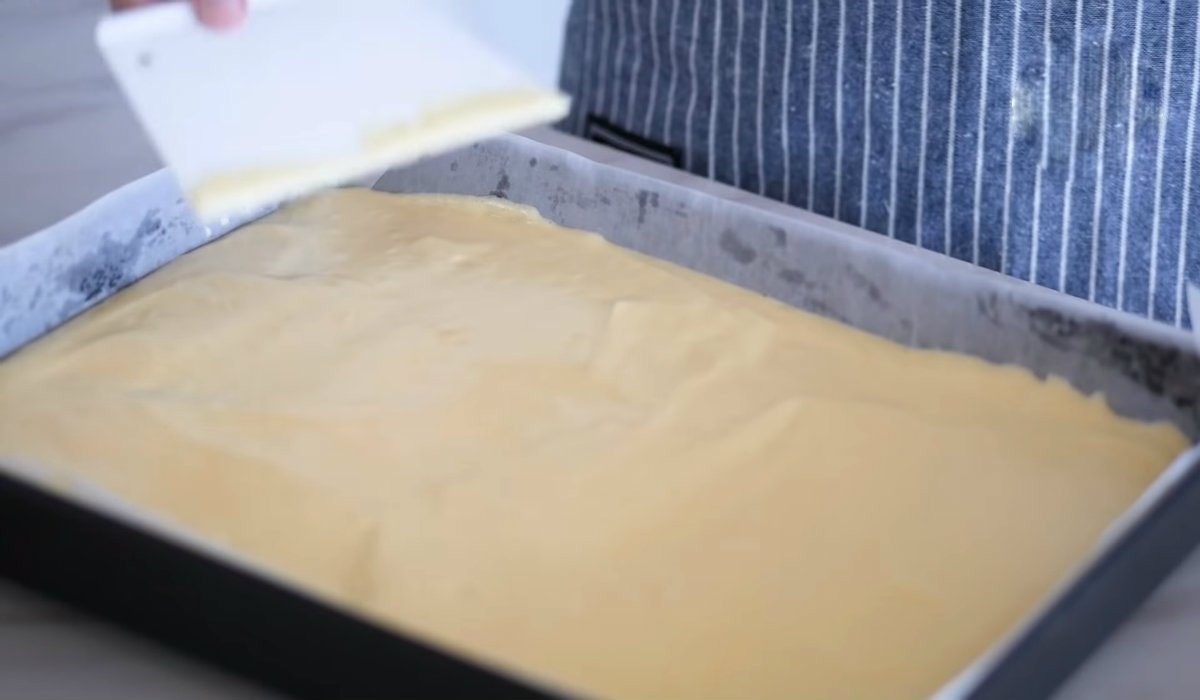 Až budete mít hotové těsto, vlijte ho na plech vystlaný pečícím papírem. Dobře rozprostřete po celé ploše a dejte péct do trouby na třicet minut při teplotě 170 °C.