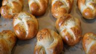 Poté ho ještě 3 minuty zpracovávejte rukou. Pak ho vyklopte na vál a rozdělte na 4 části. Z každé části udělejte bochánek. Vezměte máslo nebo margarin na listové těsto a rozdělte ho na 4 díly.