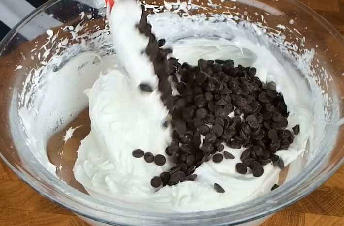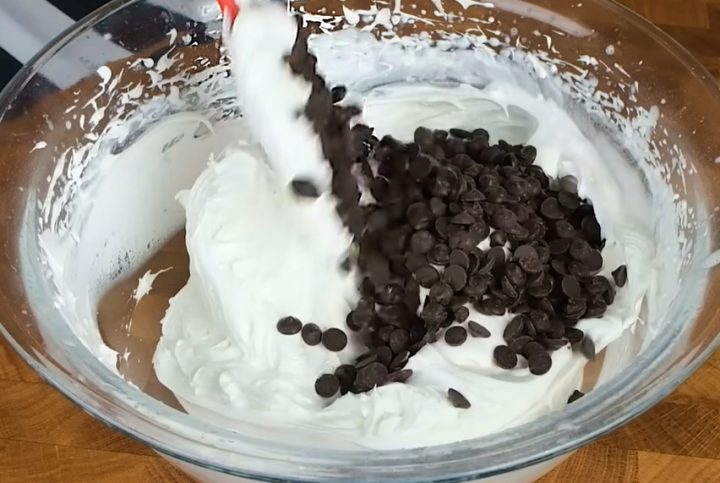 Šlehačku v prášku vysypejte do mísy a přilijte k ní plnotučné mléko. Poté směs šlehejte tak dlouho, dokud nezačne tvořit kopečky. Následně do šlehačky ještě přimíchejte čokoládové pecičky (případně čokoládu nakrájenou na malé kousky).