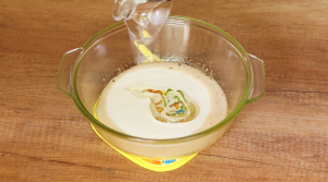 Pro zadělání těsta na krásné čajové sušenky vložte jedno vajíčko do hluboké misky, přidejte k němu cukr a metličkou obojí vyšlehejte do husté, napěněné a bělavé hmoty. K té pak přilijte 120 mililitrů kefíru a 50 mililitrů rostlinného oleje a pokračujte ve šlehání, dokud hmota nenabude na objemu a nezíská krémovitou konzistenci.