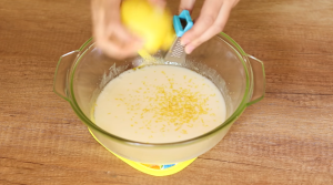 Na jemném struhadle ostrouhejte citrónovou kůru a dejte pozor, abyste nezajeli do bílé části slupky. Ta je totiž hořká a mohla by vám pokazit výslednou chuť vašich jinak báječných sušenek. Ostrouhanou kůru přisypejte do misky s vaječnou směsí a znovu vše řádně promíchejte.