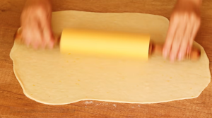 Připravte si jemné sítko, přes které do vaječné misky prosejte polovinu odměřeného množství hladké mouky a prášek do pečiva. Díky tomu by se v těstě neměly nadělat hrudky. Mouku s vejci metličkou opět dobře promíchejte. Pak přisypejte zbytek prosáté mouky a ručně uhněťte pevné, homogenní a nelepivé těsto. Zformujte z něho kuličku a válečkem ji vyválejte do velké a tenké placky.