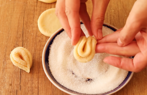 Kulatým vykrajovátkem nebo skleničkou vykrájejte z těsta malá kolečka. Do talíře nasypejte krystalový cukr, každé kolečko v něm z obou stran obalte, přeložte ho na polovinu a tu pak znovu na polovinu. Konce pak k sobě dobře přimáčkněte. Tím vytvoříte tvar podobný poupěti růže. Vyskládejte sušenky na plech vyložený pečicím papírem a vložte je do trouby vyhřáté na 180 °C péct po dobu 20 minut. Hotové sušenky vyndejte z trouby, nechte je zchladnout a podávejte se šálkem voňavého čaje nebo kávy.