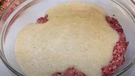 Mleté maso smíchejte s krupicí. V samostatné míse smíchejte nahrubo nakrájenou cibuli s vejci a ingredience rozmixujte dohladka.
