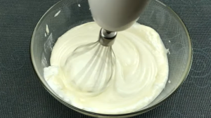 Teď vezměte k ruce odložené bílky, které ve velké míse vyšlehejte elektrickým šlehačem do velmi pevného sněhu, který po vytažení metliček zanechává pevné špičky. Do bílkového sněhu pak zašlehejte po částech zahuštěnou jogurtovou směs a vytvořte jednolitou krémovou hmotu.