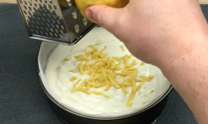 Z lednice vytáhněte odleželé těsto. Kulatou dortovou formu vyložte pečicím papírem a na dno vložte jednu těstovou kouli, kterou s pomocí prstů rozprostřete po celém dně a vytvořte upěchovaný korpus. Na korpus vlijte jogurtový krém, který rozetřete do rovnoměrné vrstvy a na povrchu uhlaďte do roviny. Druhou těstovou kouli rozbalte z fólie a přes hrubé struhadlo ji nastrouhejte na povrch celého koláče. Ten pak vložte do trouby vyhřáté na 180 °C a pečte po dobu 35 minut dozlatova.