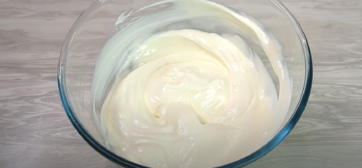 Než se korpus upeče, pusťte se do přípravy smetanové náplně. V míse si vyšlehejte zakysanou smetanu spolu s moučkovým cukrem a směs nechte chvíli chladit v lednici.