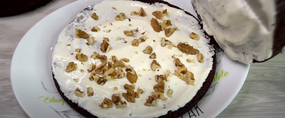 Ten spodní pomažte krémem ze smetany, posypte nadrcenými ořechy a přiklopte druhým plátem. Postup opakujte i se třetím plátem.