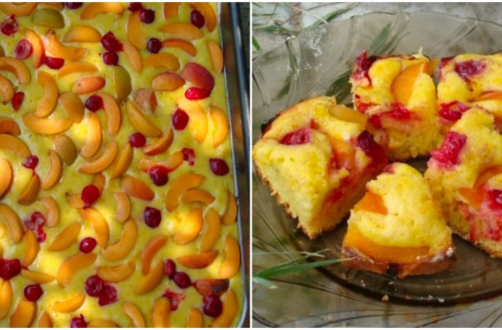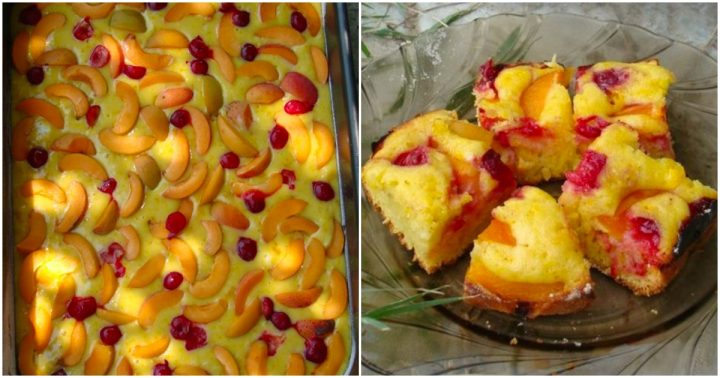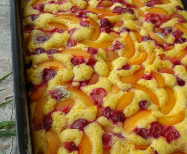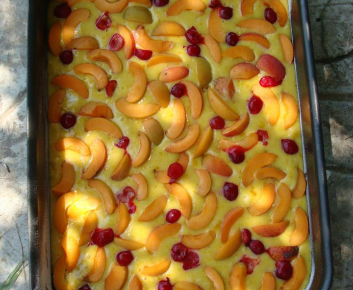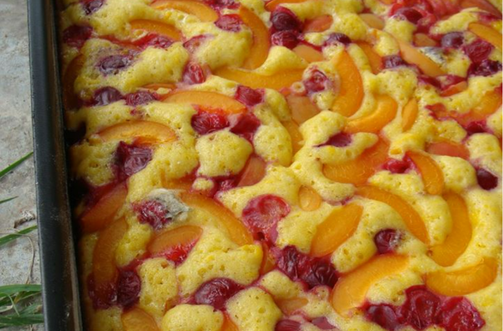 Snadný, rychlý a levný, takový je ovocný koláč na plech, jehož těsto voní jogurtem a povrch je zdobený plátky meruněk a vypeckovaných třešní. Ve skutečnosti toto ovoce můžete zaměnit za kterékoliv jiné, které máte po ruce a dokonce nemusí být ani čerstvé – stačí zavařené či zamražené a rozmrzlé ovoce. Je to velká dobrota, hotový je za pár chvil a díky tomu je včas hotový i pro nečekanou návštěvu. A jako bonus ho můžete upéct v mikrovlnce, takže bude ještě o to rychlejší.