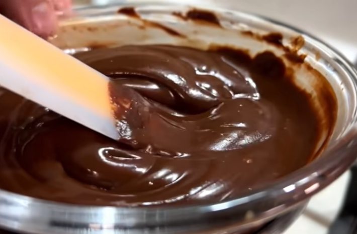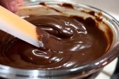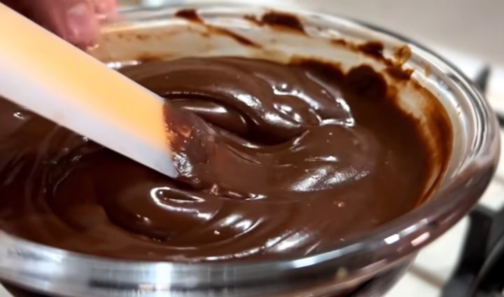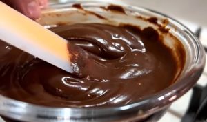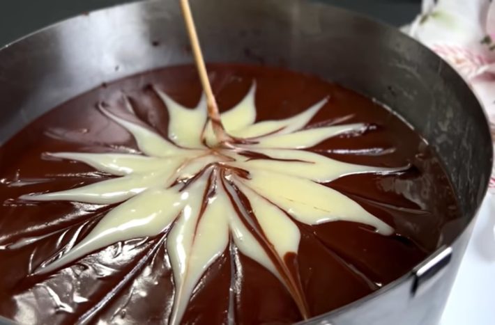 Mezitím si připravte čokoládovou polevu. Ve vodní lázni zahřejte čokoládu rozlámanou na kostičky a přelijte ji horkou smetanou. Míchejte tak dlouho, dokud nezískáte hladkou a lesklou hmotu. Bílou čokoládu taktéž rozpusťte ve vodní lázni, ale bez smetany.