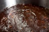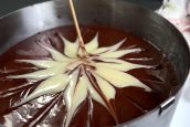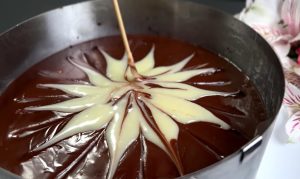 Tmavou čokoládovou taveninu pak vylijte do formy na vychlazený korpus. Rozetřete ji po celém povrchu a několikrát formou zatřeste, aby se krásně usadila do roviny. Bílou čokoládu pak nalijte doprostřed a s pomocí párátka ji vytvarujte do tvaru velkého slunce.