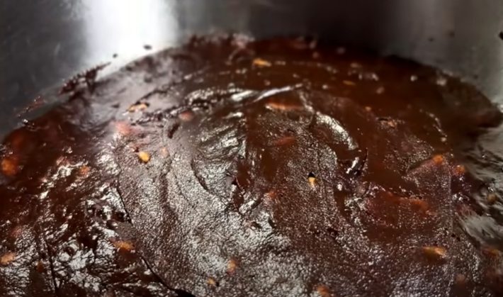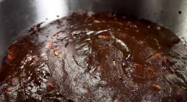 Tu pak odstavte z plotny, nalijte ji na směs rozlámaných sušenek a nasekaných vlašských ořechů a dobře promíchejte, aby se všechny kousky sušenek čokoládou obalily. Tuto směs vyklopte do kulaté formy na dort s odnímatelným okrajem vyložené acetátovou fólií, upěchujte ji na dno a vložte na 10 minut do lednice vychladit.