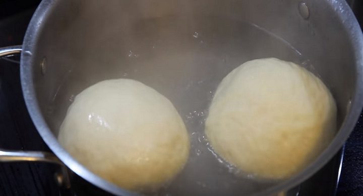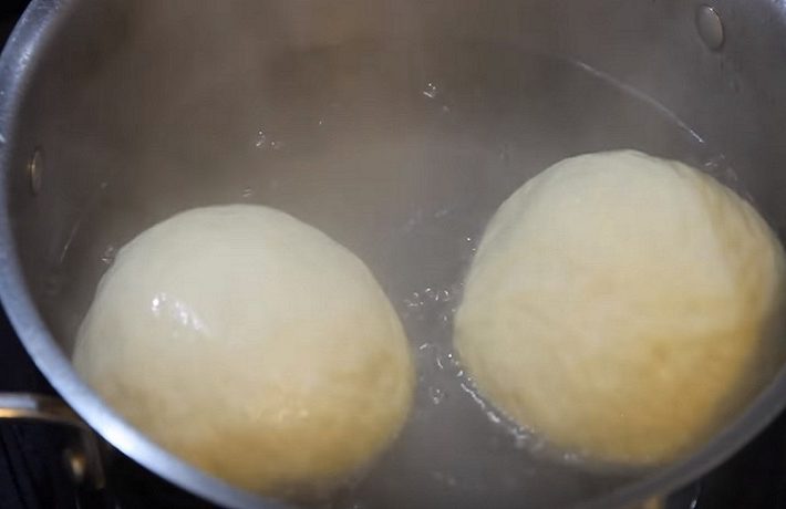 Mezitím si ve větším hrnci přiveďte vodu k varu a poté k ní přidejte dvě lžíce jedlé sody. Postupně pak ve vroucí vodě povařte jednotlivé „bochánky“ těsta tak, aby se z každé strany vařili zhruba 30 vteřin. Celkem tedy nesmí být ve vodě déle než jednu minutu. Nechte je okapat a poté je znovu uložte na připravený plech.