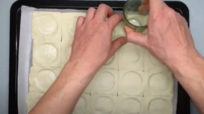 Listové těsto rozprostřete na plech, pokrytý pečicím papírem a rozřežte ho na stejně velké čtverečky. V každém z nich udělejte dnem sklenice důlek a pokračujte s přípravou omáčky.