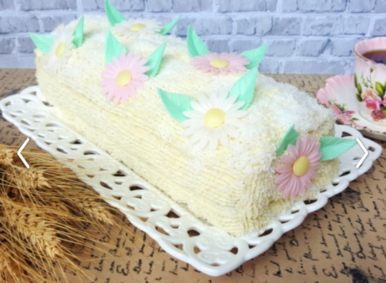 Roládu položte na tác a celou ji pokryjte zbylou polovinou krému, posypejte strouhaným kokosem a ozdobte sedmikráskami.