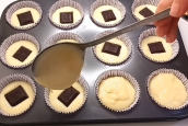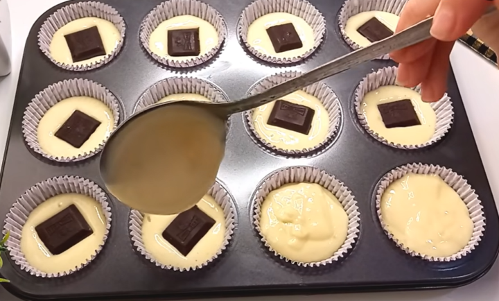 Připravte si plech na muffiny a vyložte jej papírovými košíčky. Hotové těsto do nich rozdělte tak, aby dosahovalo asi do dvou třetin košíčku. Nalámejte na kousky tabulku čokolády a doprostřed každého košíčku položte jeden čtvereček. Na čokoládu pak přidejte ještě trochu těsta, aby vám stále zbývalo asi půl centimetru od okraje.