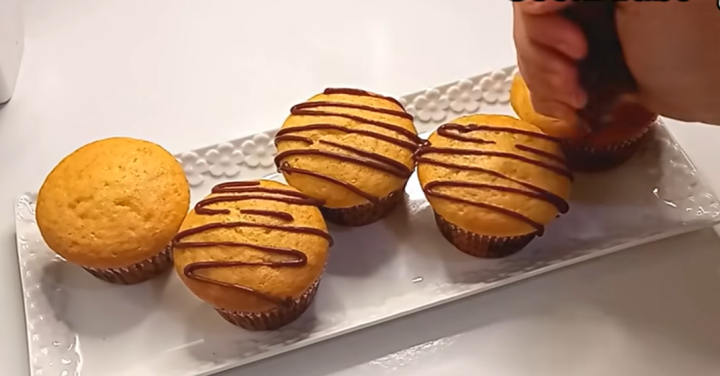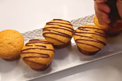 Plech s košíčky vložte do trouby předehřáté na 180 °C a pečte muffiny po dobu přibližně 30 minut dozlatova. Hotové košíčky vyběhnou nad formu a vytvoří charakteristický hříbeček. Proto dbejte na to, abyste těstu nechali ve formě dostatek prostoru, jinak se vám roztečou i mimo plech. Nakonec nechte muffiny vychladnout. Zdobicí sáček naplňte čokoládovým termixem a vytvořte jím na povrchu muffinů ozdobné cákance.