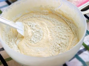 Dvakrát prosejte mouku, sůl a prášek do pečiva. Máslo a mléko zahřejte, dokud se máslo nerozpustí. Rozšlehejte vejce a postupně přidávejte cukr. Šlehejte asi po dobu 10 minut, dokud nezískáte bílou hmotu. Nyní ve třech krocích přidejte do vaječné hmoty mouku. Jemně promíchejte špachtlí zdola nahoru.