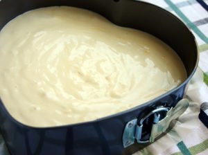 Mléko a máslo znovu zahřejte, téměř k varu, ale rozhodně ho nevařte! Nalijte horké mléko do těsta ve dvou fázích. Po každém přidání míchejte špachtlí zdola nahoru. Vložte těsto do formy. Ideální je odnímatelná forma.