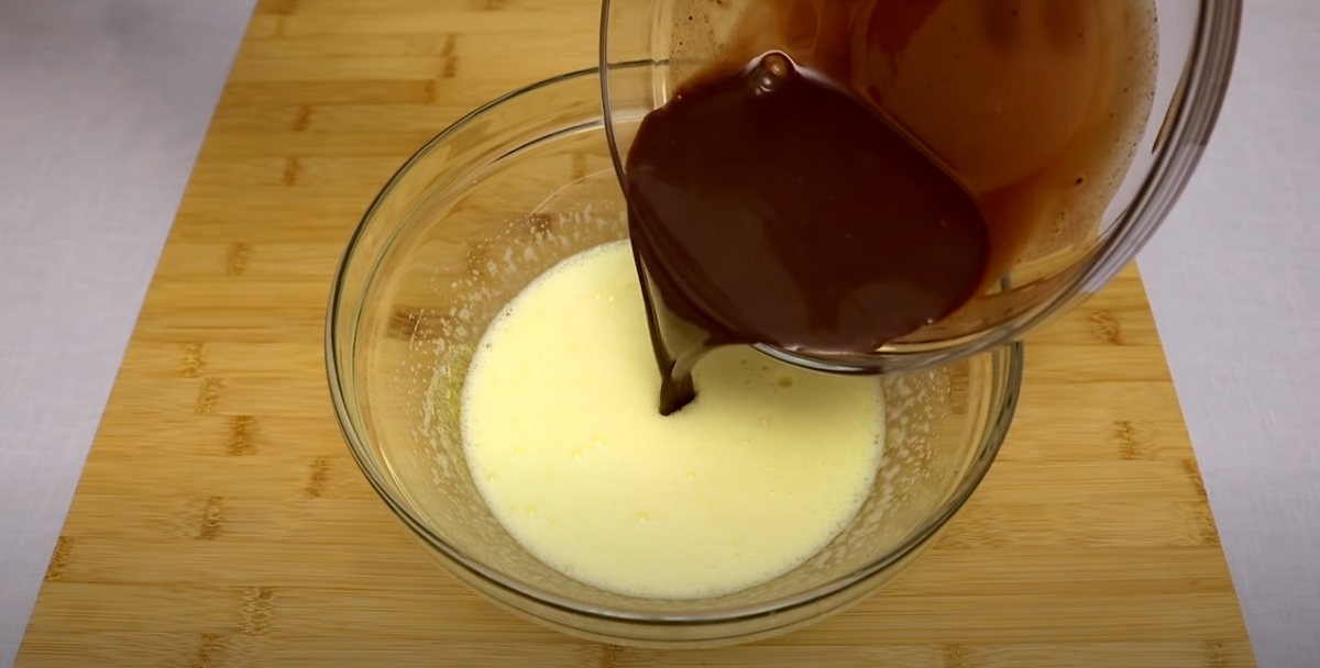 Horké mléko vlijte do mísy a rozmíchejte v něm krupicový cukr s kakaovým práškem. Až hmota trochu vychladne, zakomponujte do ní vejce a šlehejte po dobu tři až čtyř minut.