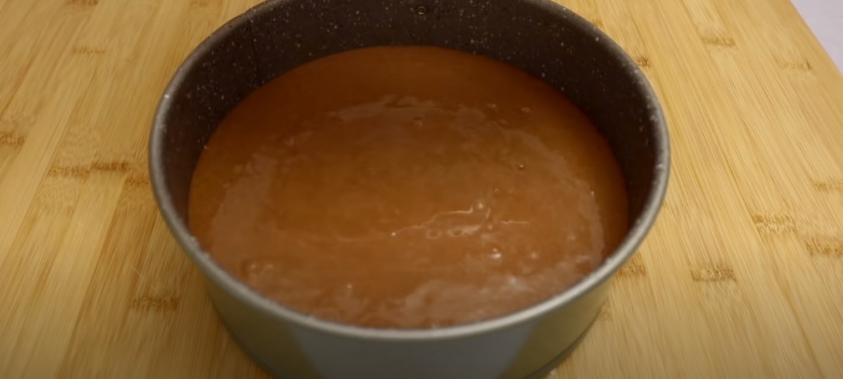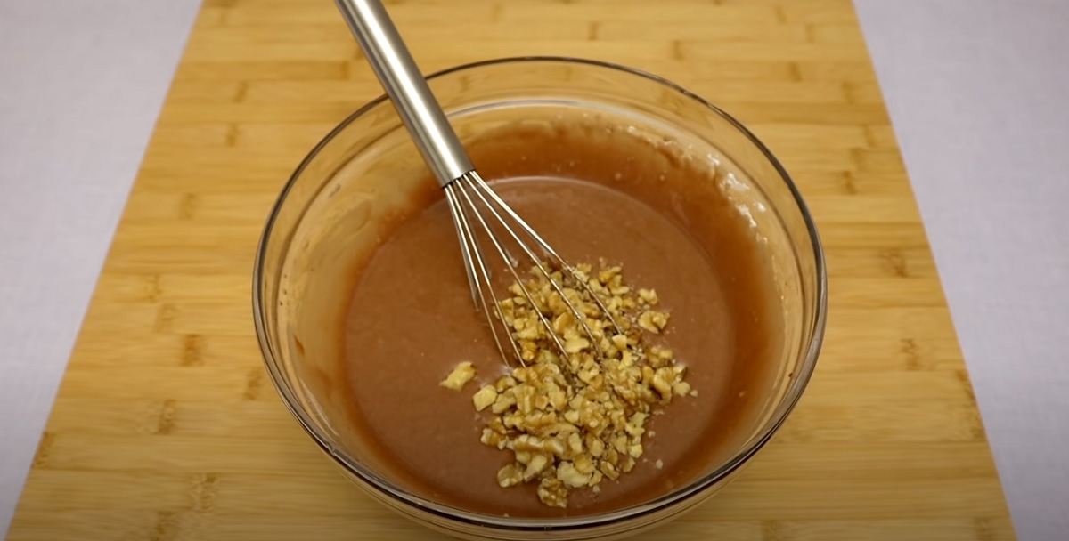 Nyní si k ruce vezměte koláčovou formu vystlanou pečícím papírem a vlijte do ní připravené kakaové těsto s vlašskými oříšky.